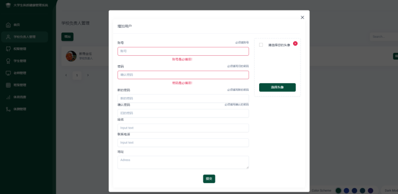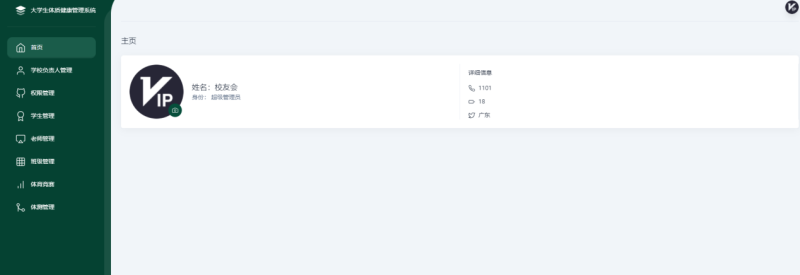 该体测系统涉及4个角色,管理员角色,学校负责人角色,老师角色,以及学生角色。学校负责人负责管理老师,老师负责管理学生;当学校有体测计划进行时,学校负责人可以对体测计划进行增删改查,当学校负责人分布了体测计划之后,应该能有消息通知到老师,老师再把消息通知给学生,如通知学生下午几点在某某地点进行体测,学生要能确认收到消息。老师给学生体测完之后可以通过成绩的Excel文件将成绩上传到系统,老师将成绩上传到系统之后学生可以查询成绩,同时还支持老师将体测情况的视频上传,以便学生对成绩提出质疑时有考试情况的依据(如果当时有录制视频的话),老师可以选择上传体测情况的视频也可以选择不上传;体测结束之后,学校负责人可以看到当前体测计划的及格率,优秀率统计。